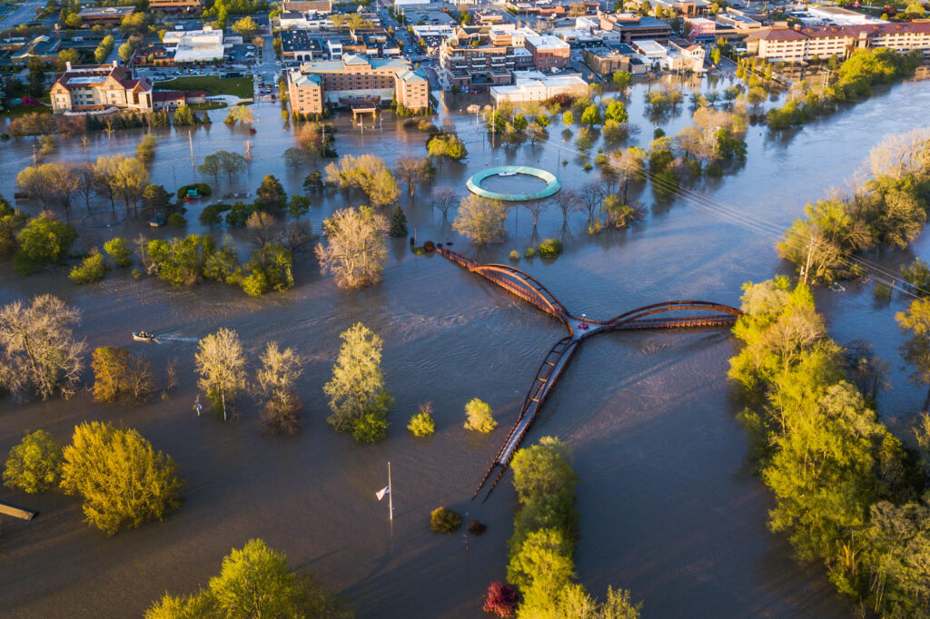 In May 2020, two dams failed on the Tittabawassee River northwest of Midland, MIchigan, flooding the town.